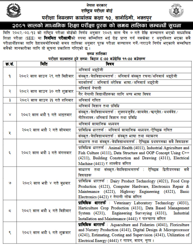 एसईईको पूरक परीक्षाको रुटिङ निस्किएको छ । राष्ट्रिय परीक्षा बोर्डले २०८१ सालमा लिएको परीक्षाको नतिजा प्रकाशित गर्दै पूरक परीक्षाको मिति साउन २९ गतेदेखि तोक्दै परिक्षातालिका प्रकाशिन गरेको हो । हेर्नुस पुरा तालिकामा ।