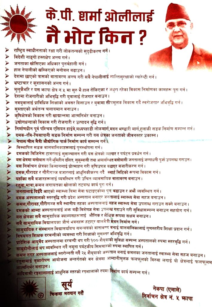 केपी शर्मा ओलीलाई नै भोट किन भन्ने शिर्षकको अपिलमा खस्किएको मनोबल उठाउनका लागि ओलीलाई जिताउनु पर्ने उल्लेख गरिएको छ । ‘देशमा छाएको त्रासको वातावरण अन्त्य गरी सबै नेपालीलाई शान्ती सुरक्षाको ग्यारेन्टी गर्नका लागि ओलीलाई मत दिनुपर्दछ’ अपिलमा भनिएको छ ‘झापा ५ मा सुरु गरिएका विकासका अधुरा योजनाहरुलाई सम्पन्न गर्नका लागि केपी ओलीलाई मत दिन अपिल गरिन्छ ।’