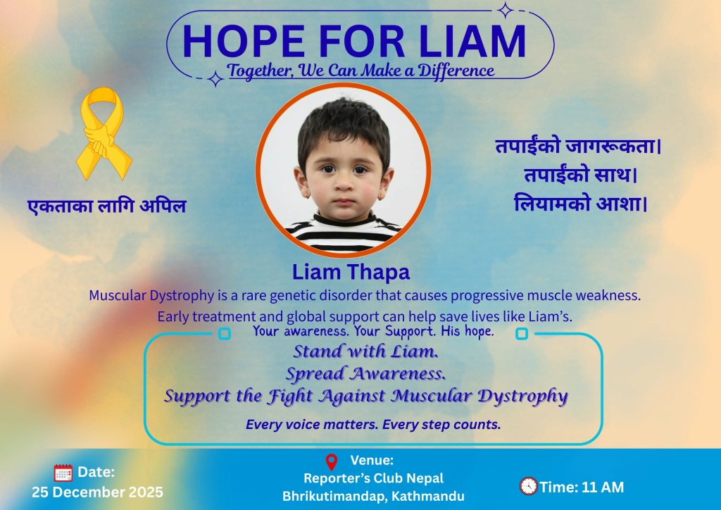 काठमाडौं, दुर्लभ तथा जटिल आनुवंशिक रोग डचेन मस्कुलर डिस्ट्रोफी (म्गअजभललभ ःगकअगबिच म्थकतचयउजथ–म्ःम्) सम्बन्धी जनचेतना अभिवृद्धि गर्ने तथा यस रोगबाट पीडित बालबालिकाको उपचारमा सहयोग जुटाउने उद्देश्यले राजधानीमा पुस १० गते विशेष कार्यक्रम सम्पन्न भएको छ । “होप फर लियाम” अभियानको पहलमा रिपोर्टर्स क्लब नेपाल, भृकुटीमण्डपमा आयोजित उक्त कार्यक्रममा रोगसम्बन्धी जानकारी, प्रभावित परिवारका अनुभव तथा उपचारका चुनौतीहरू सार्वजनिक रूपमा उजागर गरिएका थिए ।
