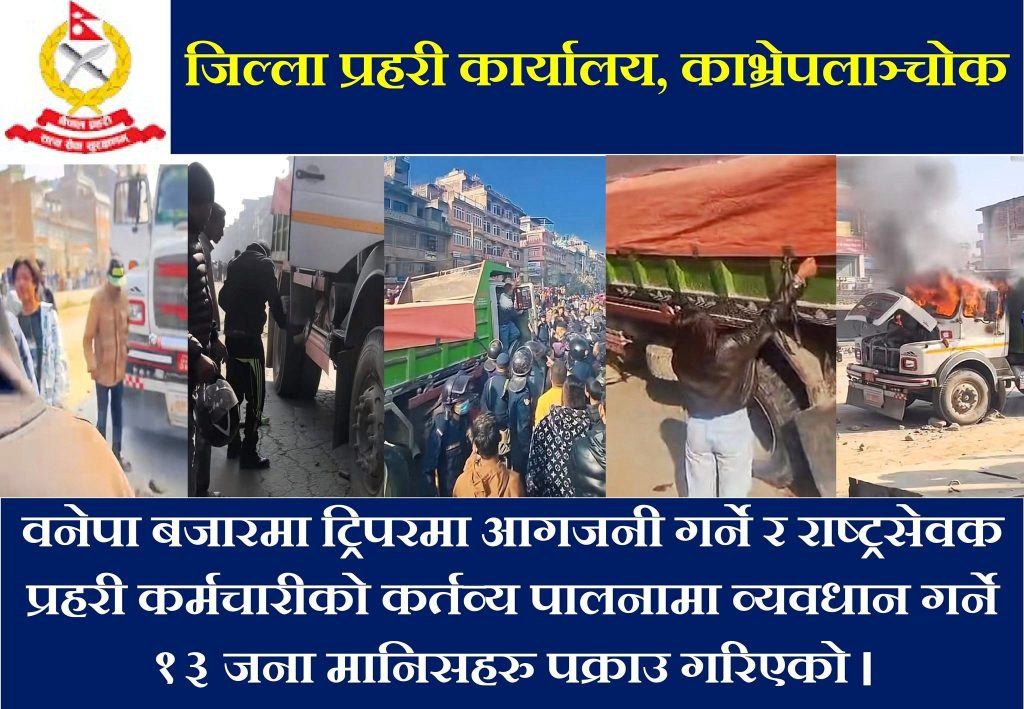 बनेपाबाट साँगातर्फ गइरहेको बा.प्र.०१–००४ क ३४२३ नम्बरको टिपरले सोही दिशातर्फ गइरहेको बा.प्र.०२–०६३ प ९१८९ नम्बरको स्कुटरलाई ठक्कर दिँदा एक जनाको मृत्यु भएको थियो । दुर्घटनामा स्कुटर चालक धुलिखेल नगरपालिका–५ का ३० वर्षिय ओमन प्रधानको मृत्यु भएपछि आक्राशित भिडले टिपरमा आगजनी गराएका थिए । साथै अनुसन्धानका लागि खटिएको प्रहरी टोलीमाथि ढुंगामुढा गरी अनुसन्धान कार्यमा अवरोध पनि गरेका थिए । सो टिपरमा आगजनी गरी क्षति पुर्याउने १३ जना पक्राउ परेका हुन् ।